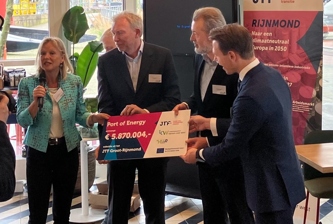 Tijdens een bijeenkomst in het Maritiem Museum op 3 april hebben de Rotterdamse wethouders Tim Versnel en Chantal Zeegers een subsidie uit het Just Transition Fund uitgereikt voor arbeidsmarktprojecten.